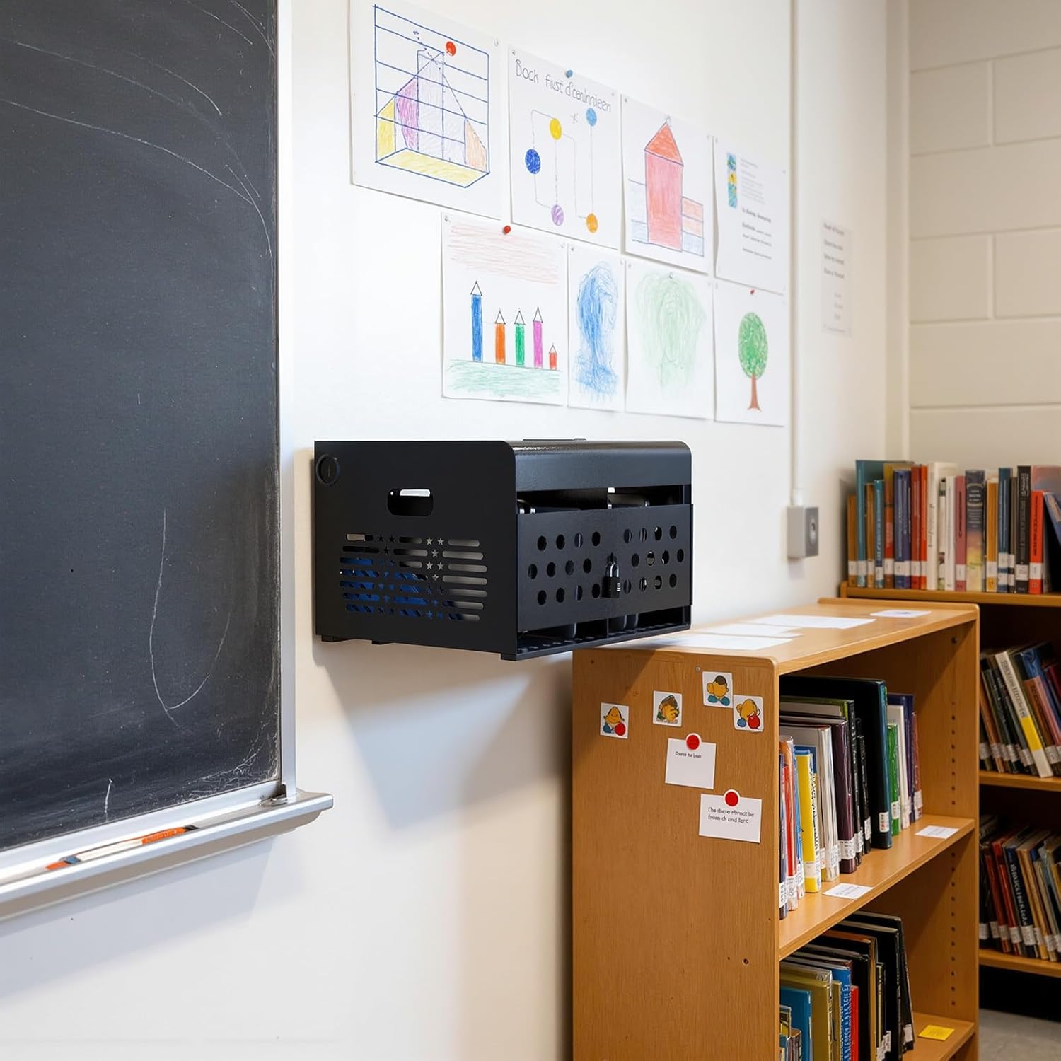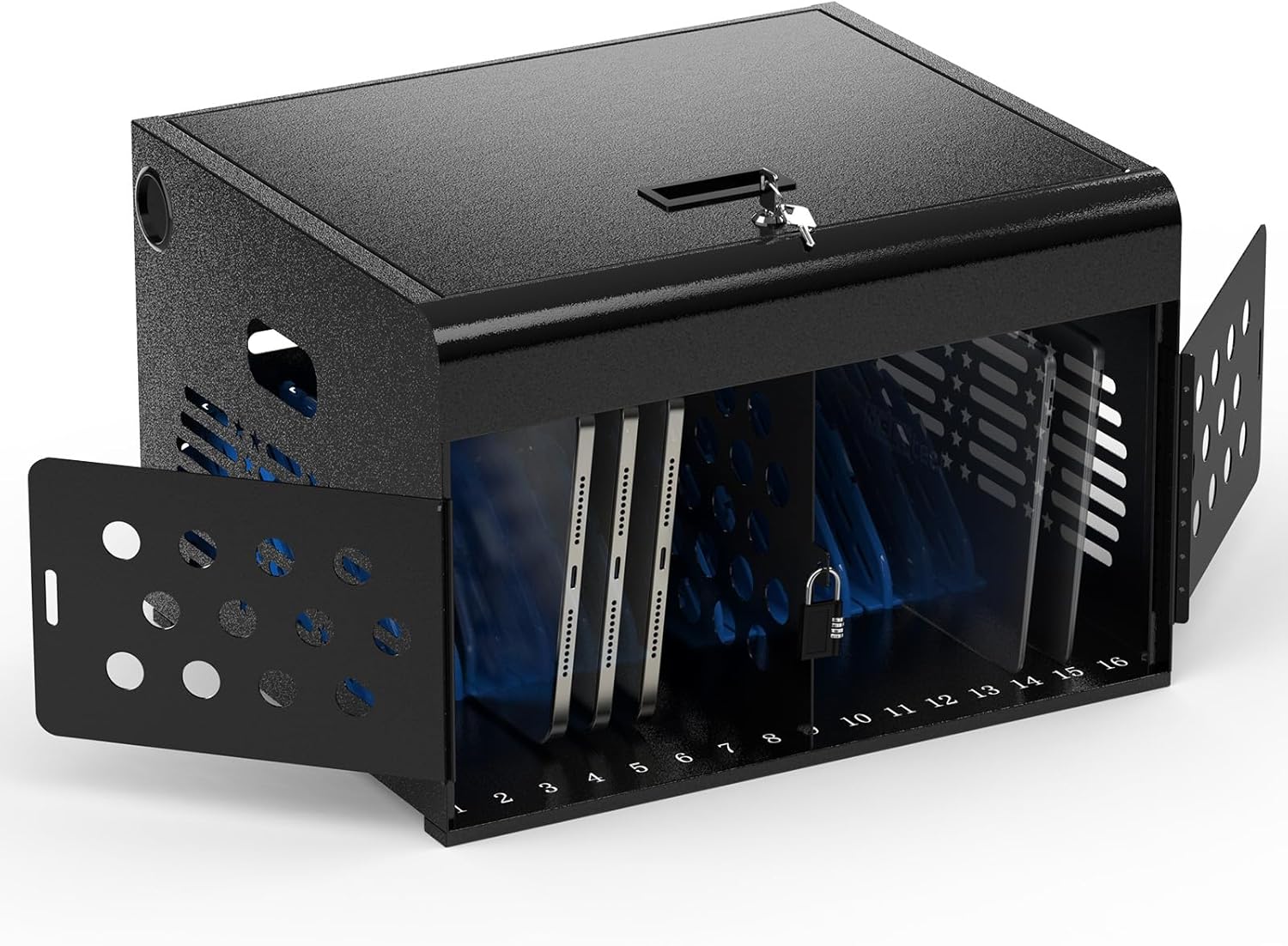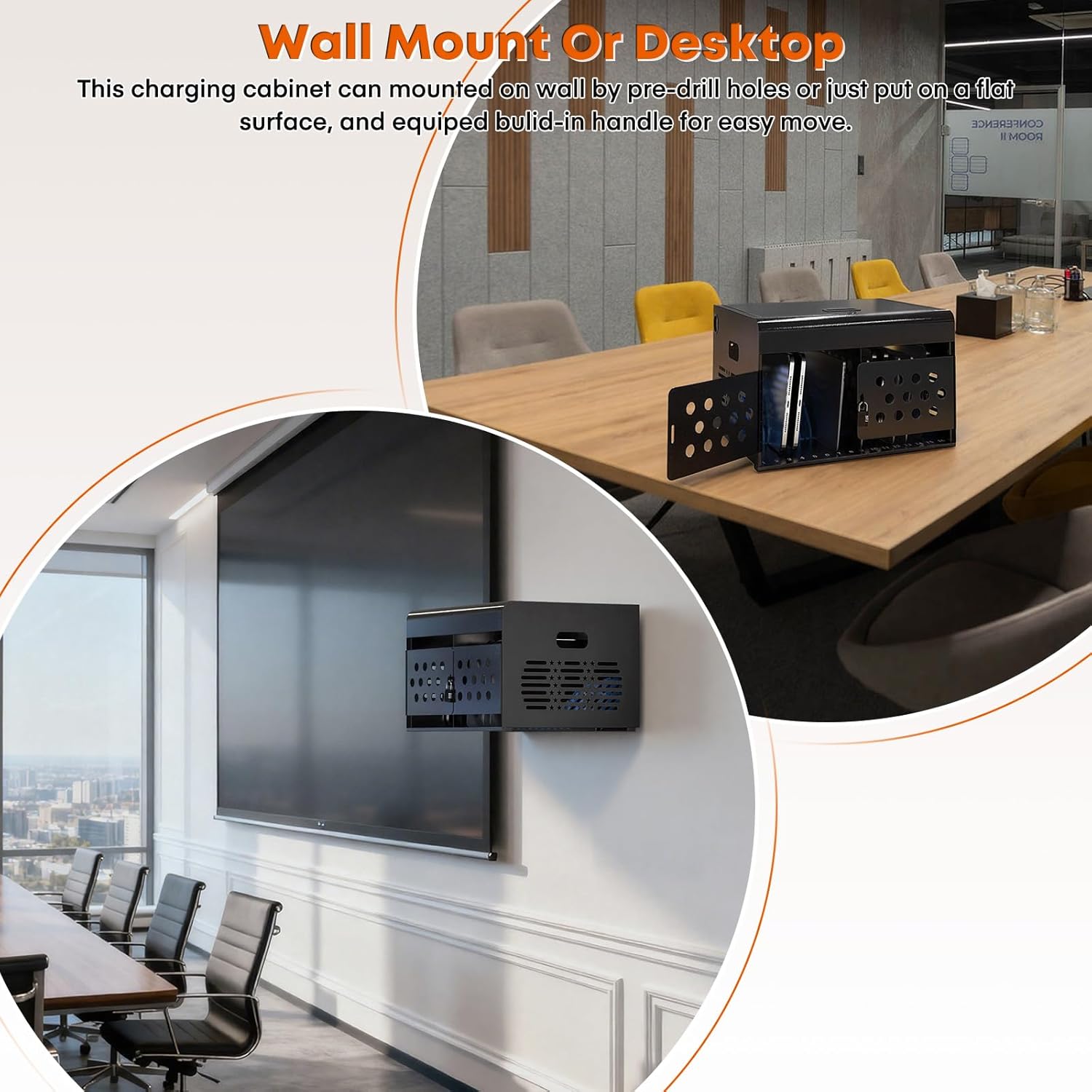 - CARRY OR WALL MOUNT: Our tablet charging station locking cabinet can be installed on walls, or set flat on desk or table. Hardware is included for wall mounting, and the built-in handle on this light weight portable Chromebook cabinet is designed for easy carry.