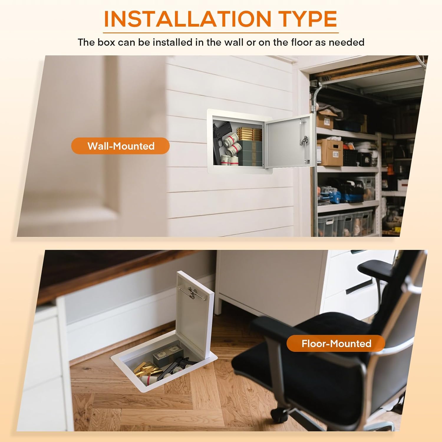 - CUSTOMIZABLE STORAGE & INSTALLATION OPTIONS:Our wall security box features a removable built-in shelf, allowing you to easily adjust between two levels of storage or a full-depth compartment. It offers flexible installation, either mounted on the wall or placed on the floor.