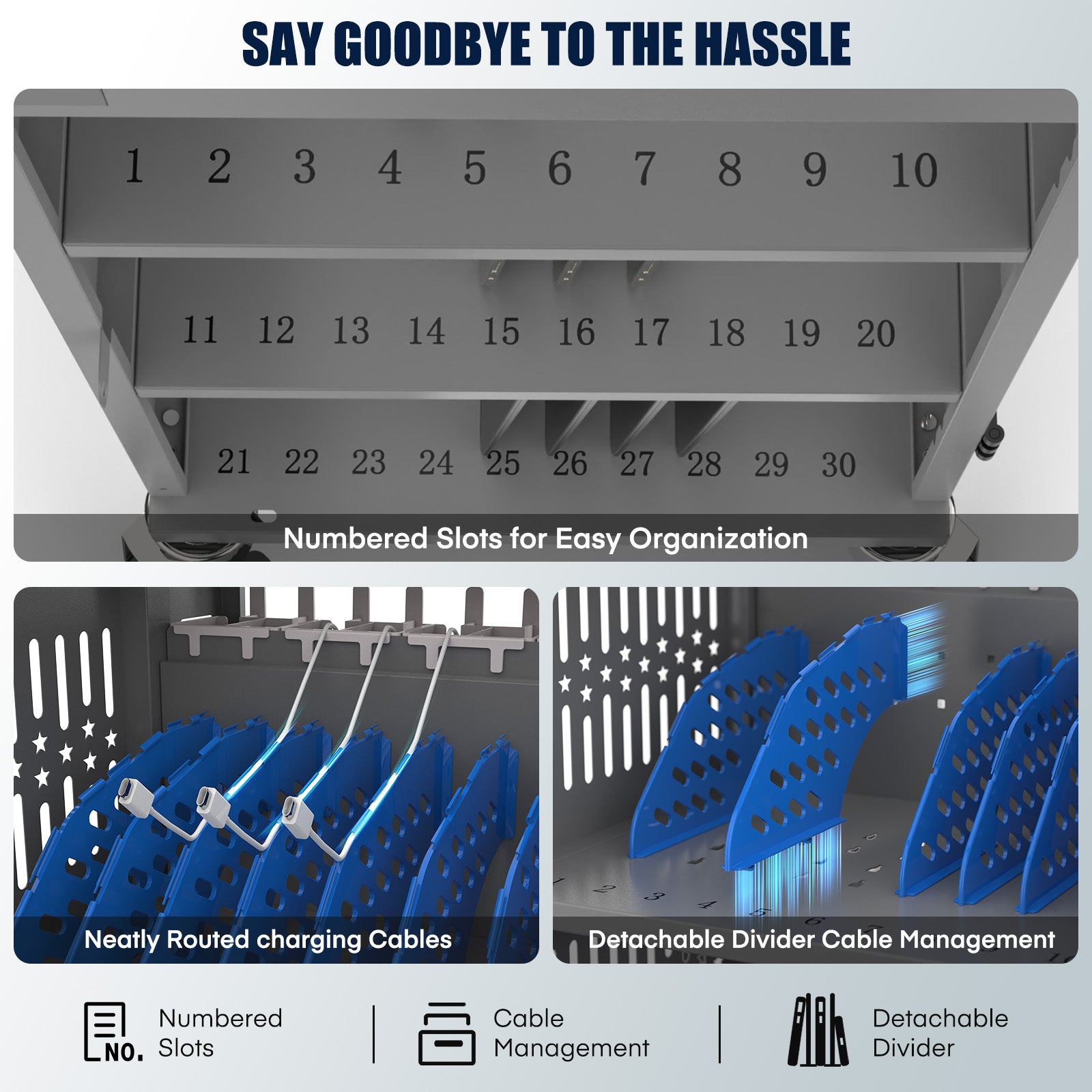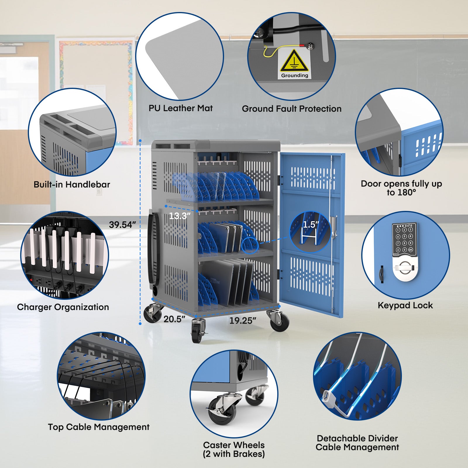 - Pre-Assembled: This laptop rolling storage cart will arrive fully assembled out of the box, simply attach the cord wrap and wheels, then you can start using this 30-device charging cart in your classroom.
