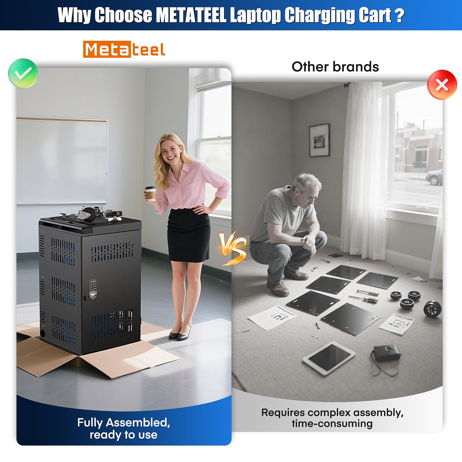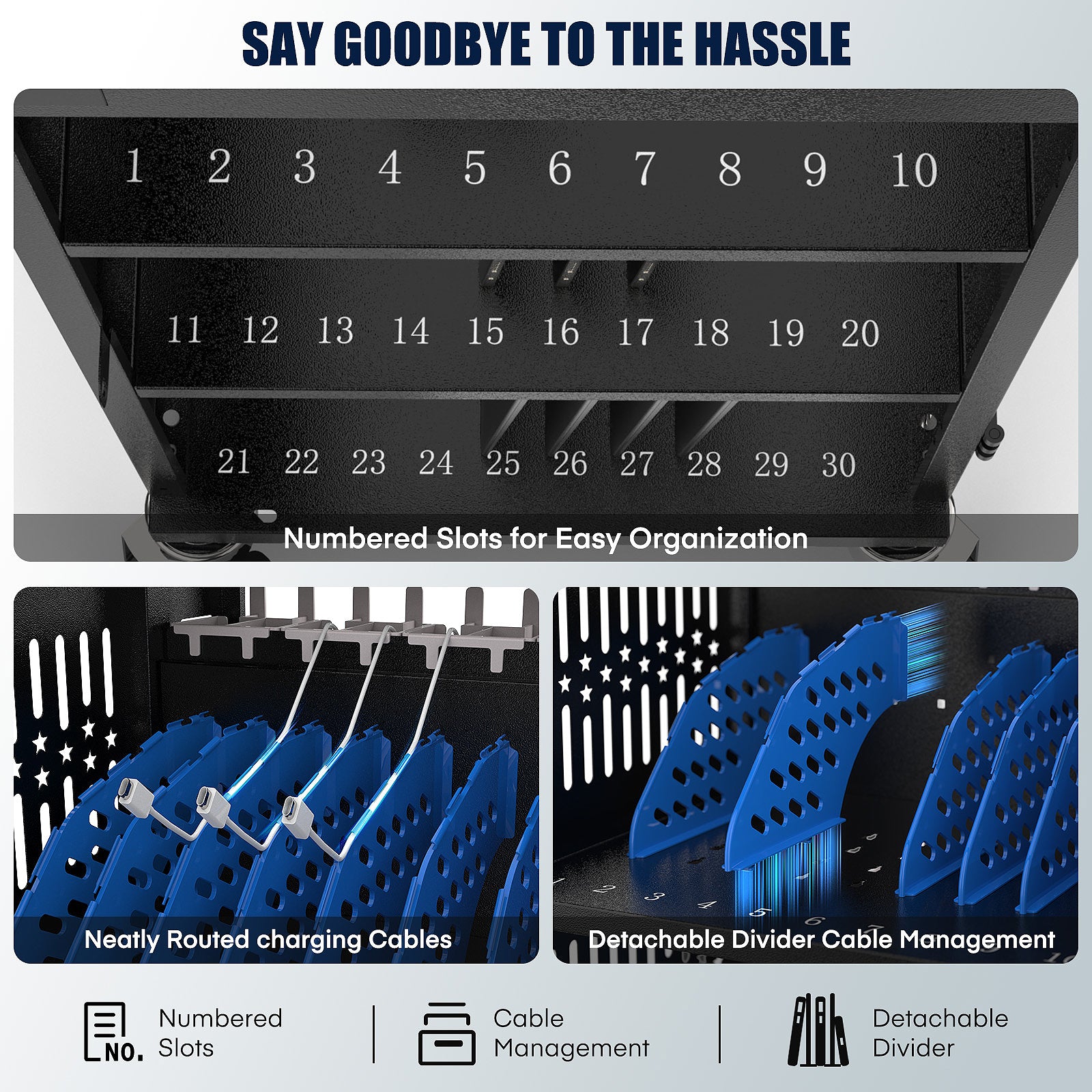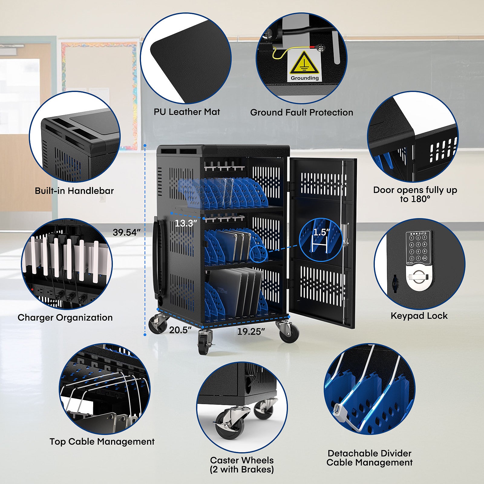 - Pre-Assembled: This laptop rolling storage cart will arrive fully assembled out of the box, simply attach the cord wrap and wheels, then you can start using this 30-device charging cart in your classroom.