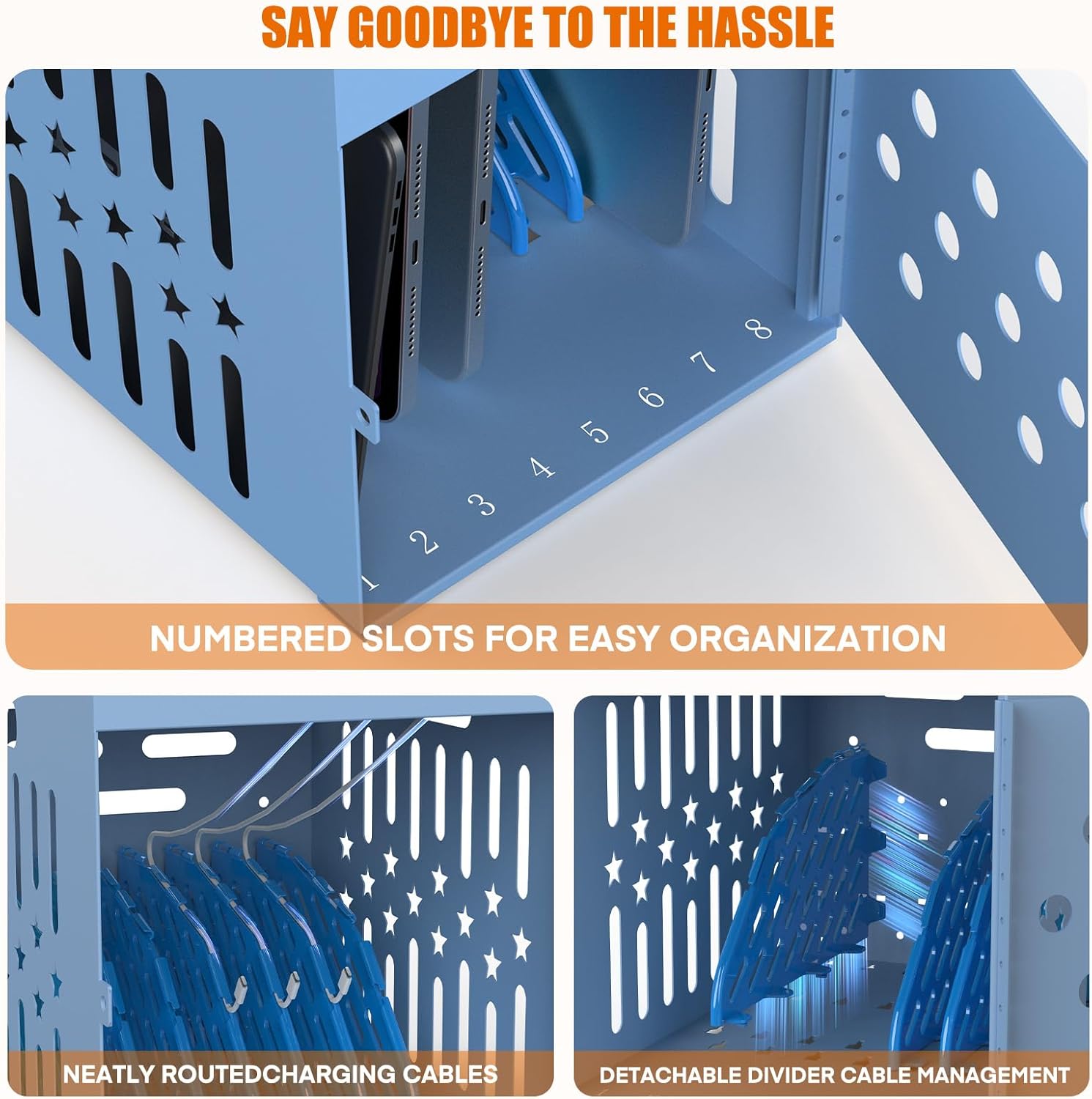 - TABLET CHARGING STATION: Features 8 divider slots for charging, storing, and transporting up to 8 tablets and electronic devices. Can be securely mounted to walls or sit on a flat surface.