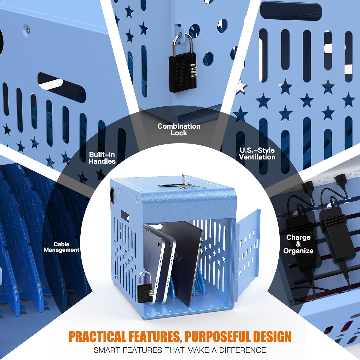 - LOCK & KEY INCLUDED: Includes 2 keys and a combination lock for complete security. This charging station is designed to be used in multiple settings, including classrooms, offices, and hospitals.