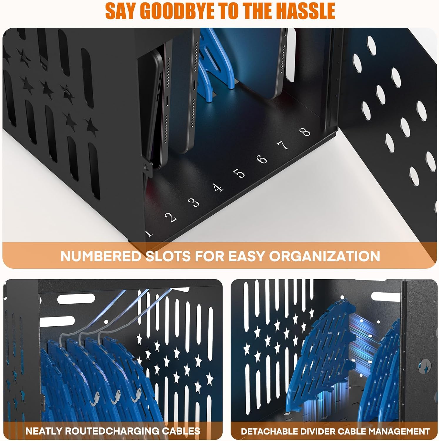 - TABLET CHARGING STATION: Features 8 divider slots for charging, storing, and transporting up to 8 tablets and electronic devices. Can be securely mounted to walls or sit on a flat surface.
