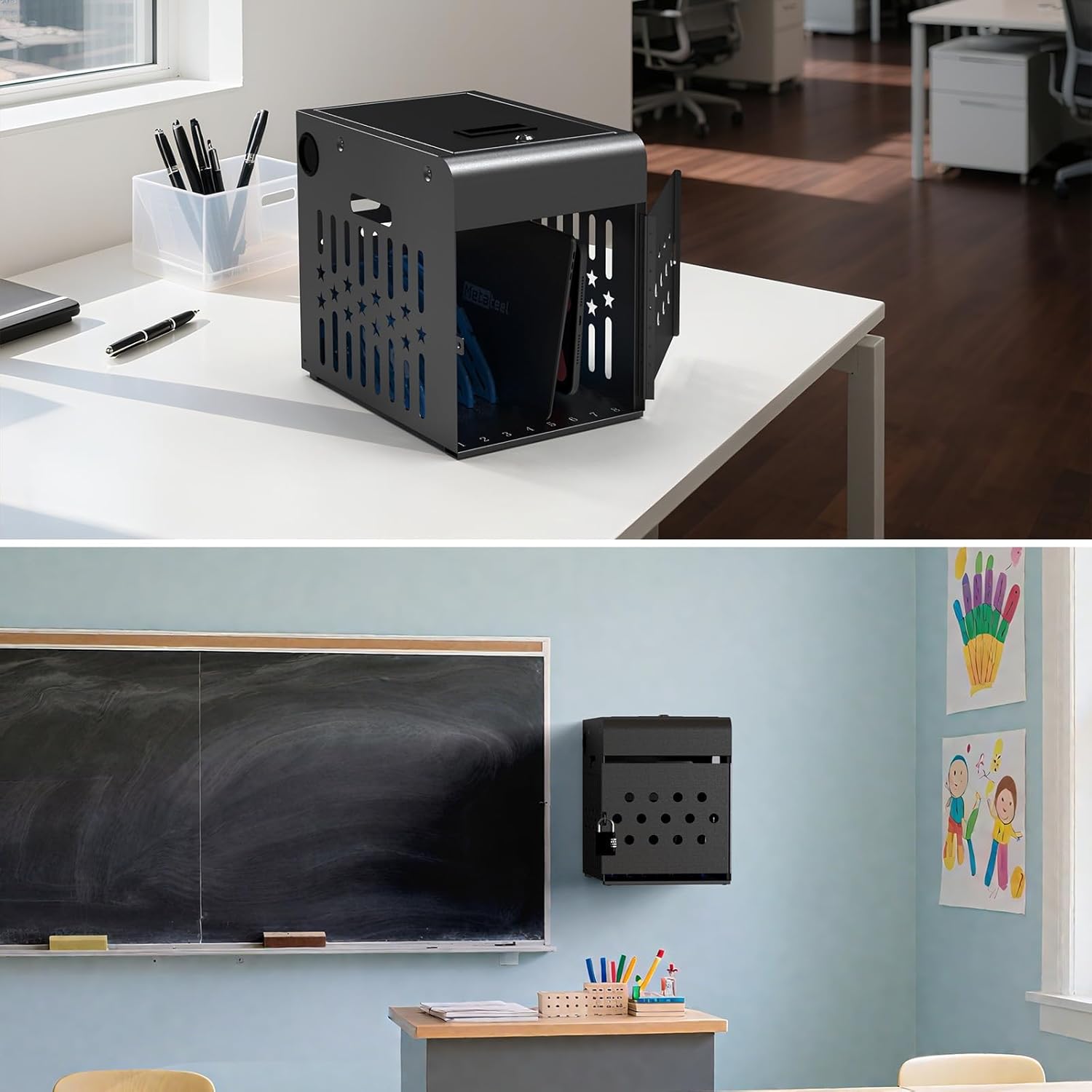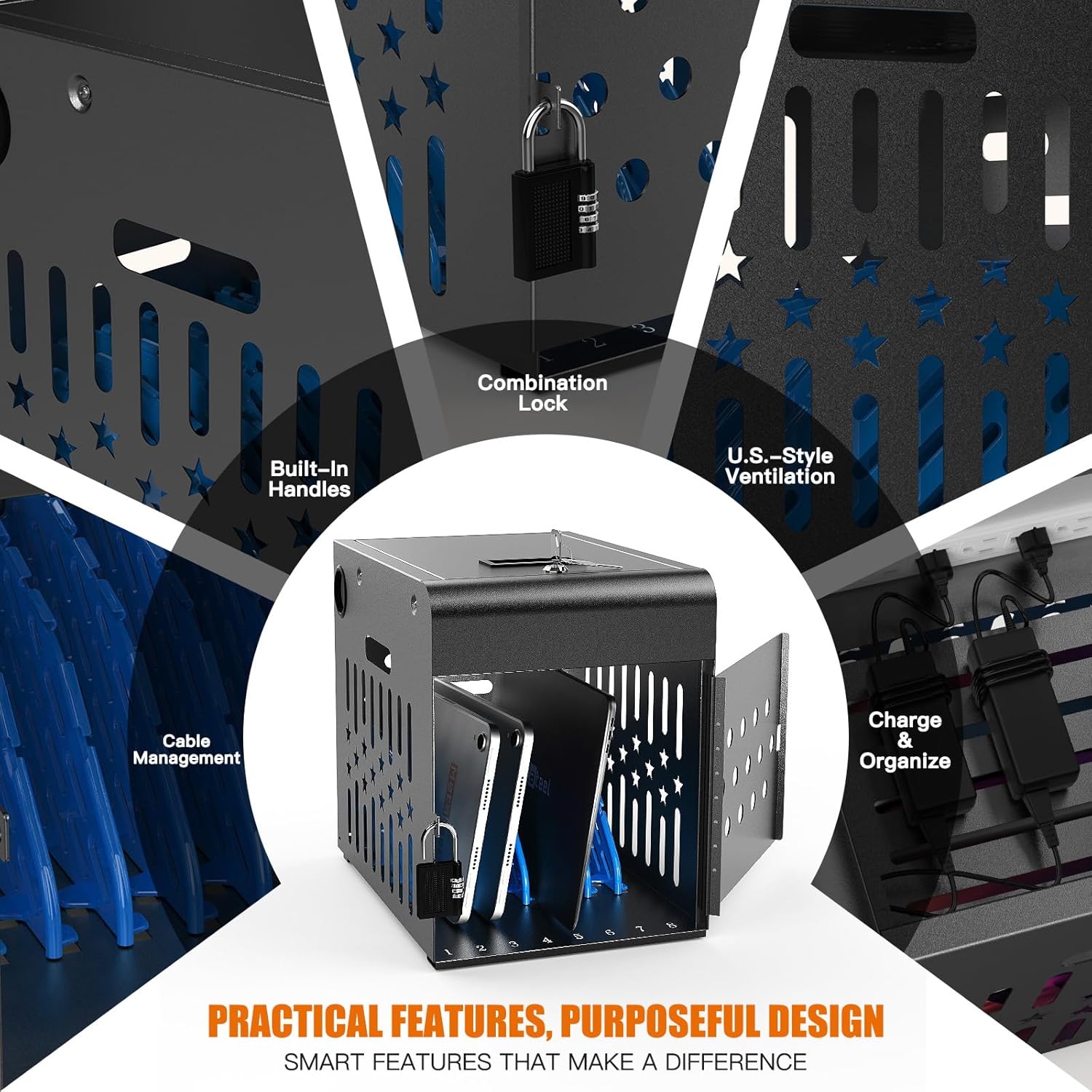 - LOCK & KEY INCLUDED: Includes 2 keys and a combination lock for complete security. This charging station is designed to be used in multiple settings, including classrooms, offices, and hospitals.